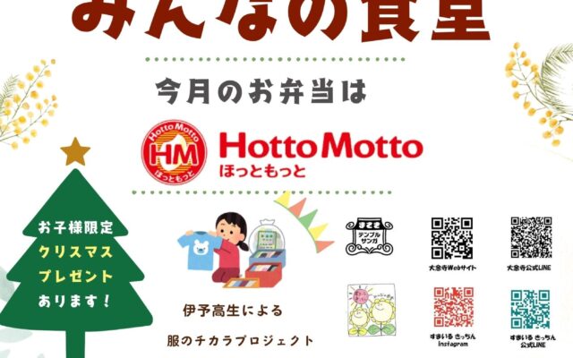 次回の大念寺みんなの食堂は12/7(日) Hotto Mottoさんによるお弁当です。 サイドメニューはお味噌汁 11時より受付開始整理券をお渡しいたします。 11時半よりお弁当配布 13時よりフードパントリーを開催いた